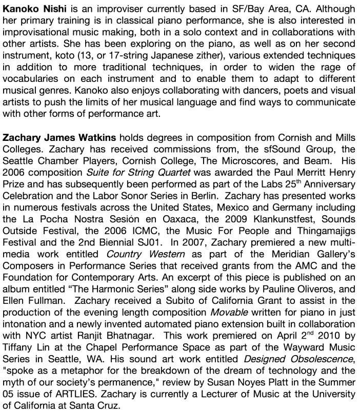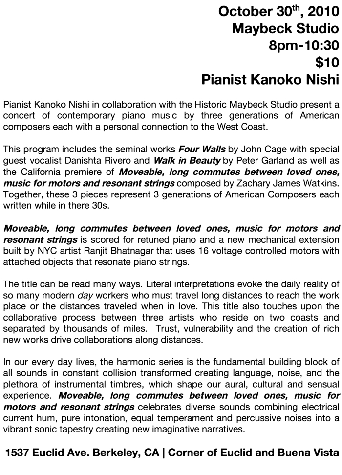April 2nd Mills College Songlines Series " Movable Long Commutes Between Loved Ones, Music for Motors and Resonant Strings"