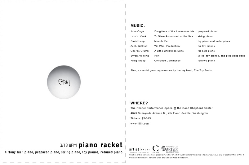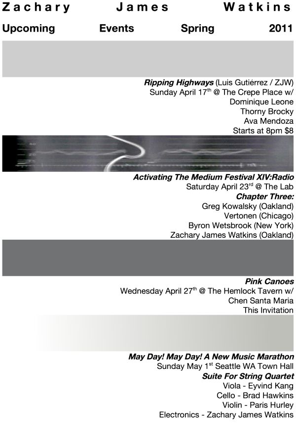Premeire of New commission by Cornish College and the Seattle Chamber Players to write a new 5 minute work. This is part of "Breaking Barriers": Presenting a new composition by new music crusader and Cornish composer-in-residence, Frank J. Oteri as well as new works by Cornish alumni composers. I will be sharing this opportunity with Cornish alums, Eyvind Kang and Gretta Harley. Poncho Hall. more info