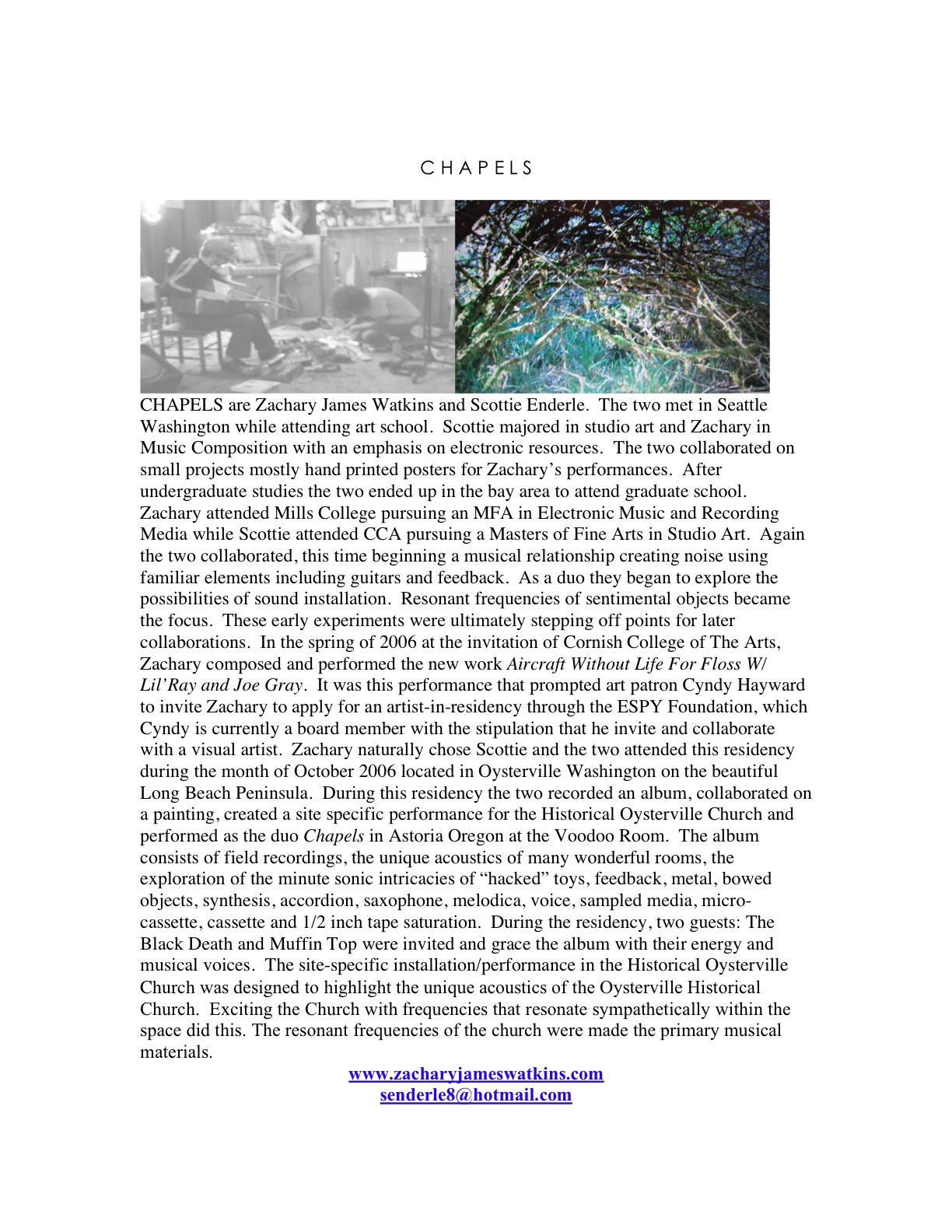 An art show set in an alternative space. The third floor of an abandoned Office building in Lubbock Texas was "inhabited" by myself and five other collaborators. The space was the main source of our artistic materials. I created three sound art pieces for this show utilizing abandoned office machinery, field recordings made within the building and hand built circuits. I also performed a duet playing hand built electronic circuits and circuit bent battery powered toys with fellow collaborator Szu Han Ho on violin. The opening night was March 4th 2005. 3rd floor was reviewed by Susan Platt and is published in the summer issue of
